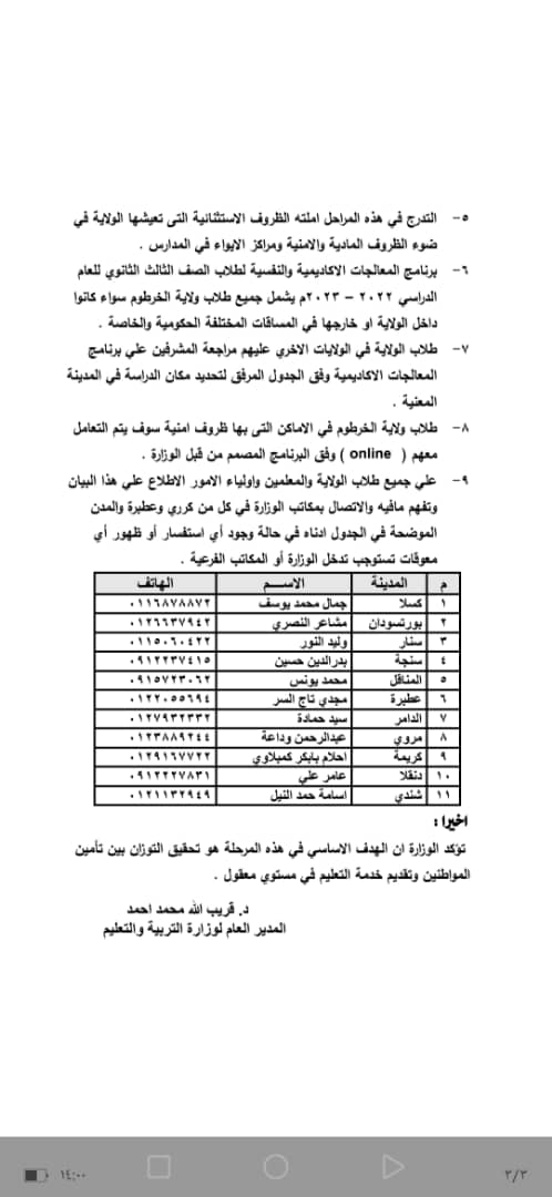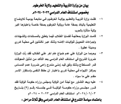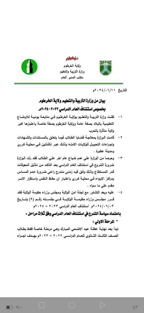 أعلنت وزارة التربية والتعليم بولاية الخرطوم ، عن إستئناف الدراسة بالولاية عبر ثلاث مراحل ، تبدأ المرحلة الأولى منها عقب عطلة عيد الأضحى المُبارك،