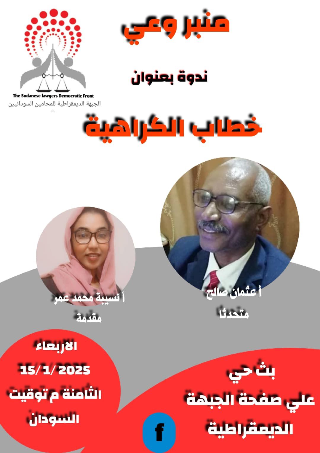 علي صفحة الجبهة الديمقراطية للمحامين علي الفيسبوك، استضاف ’’ منبر وعي المحامي ‘‘ والمدافع القانوني صالح عثمان، في الخامس عشر من يناير 2025، حول خطاب الكراهية واثره علي المجتمع في ظل استمرار الصراع الان، اصبح خطاب الكراهية ظاهرة بارزة، ومؤثرة في النسيج الاجتماعي، ادت الي انقسامات عرقية وسياسية.