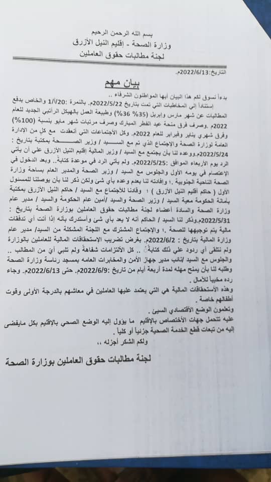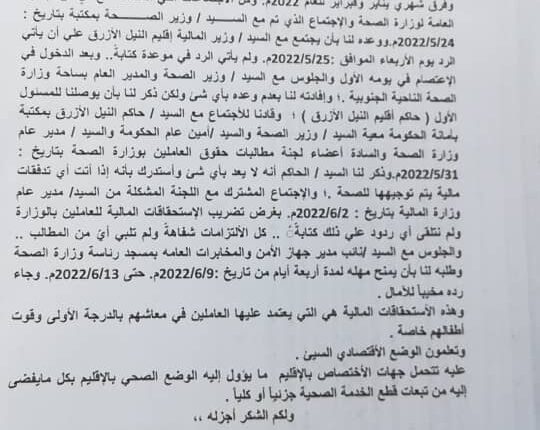 قررت لجنة مطالبات حقوق العاملين بوزارة الصحة بإقليم النيل الأزرق ، إستمرار الإضراب التام عن العمل بكل المرافق الصحية بالإقليم ، وذلك إعتبارا من اليوم الإثنين 13 يونيو لحين سداد الإستحقاقات المالية كاملة غير منقوصة ، وذلك بعد المهلة التي منحت لجهة الإختصاص منذ يوم 8 يونيو الحالي .