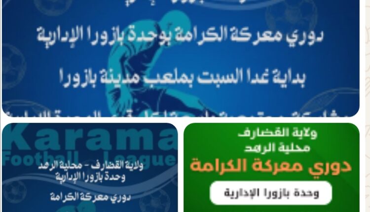 إنطلقت اليوم بملعب مدينة بازورا فعاليات دوري معركة الكرامة، الذي تنظمه المقاومة الشعبية بوحدة بازورا الإدارية بمحلية الرهد بمشاركة واسعة من جميع قرى الوحدة الإدارية.