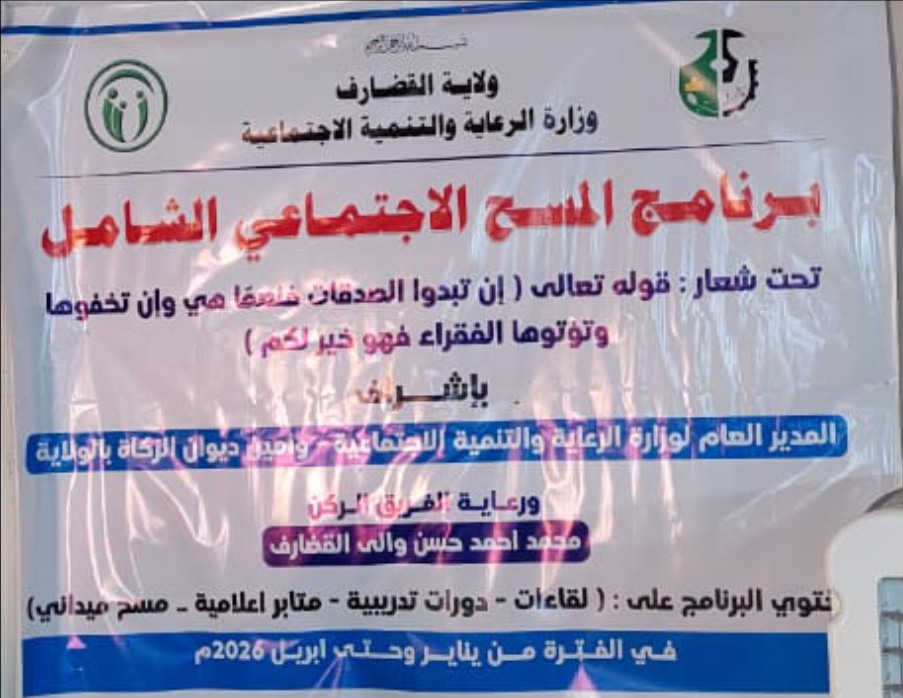 شرعت ولاية القضارف في استكمال الترتيبات لانطلاقة برنامج المسح الاجتماعي الشامل لحصر الفقراء والمساكين، حيث عقدت اللجنة العليا للبرنامج اجتماعاً تنويرياً بقاعة مجلس رعاية الطفولة، استهدف المدراء التنفيذيين بالمحليات والجهات ذات الصلة.