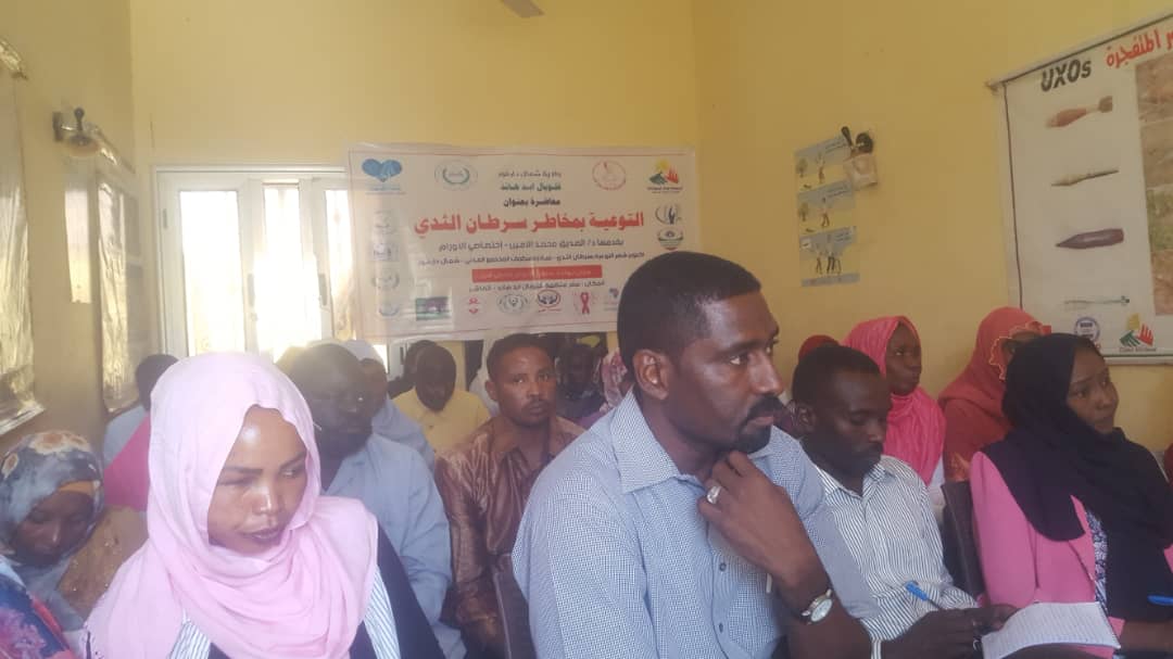 حيث أقيمت بمنظمة قلوبال أيد هاند ، بمدينة الفاشر ، اليوم ، محاضرة تنويرية عن الأورام الحميدة والخبيثة ، خاصة سرطان الثدي ، وذلك بمشاركة ٣٧ مشاركا ، من ممثلي منظمات المجتمع المدني وذلك فى فى إطار التوعية بمخاطر سرطان الثدي .