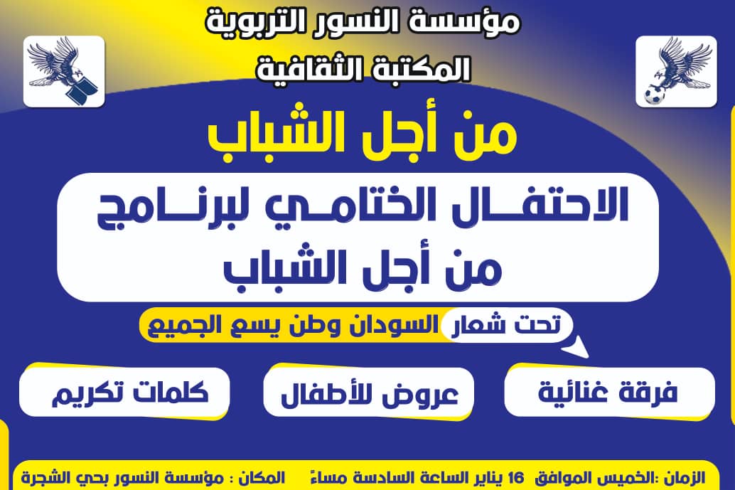 إختتمت مؤسسة النسور التربوية – قسم المكتبة الثقافية، برنامجها التثقيفي “من أجل الشباب”، يوم الخميس الموافق 16 يناير 2025م، في تمام الساعة السادسة مساءً، ببورتسودان بولاية البحر الأحمر.
